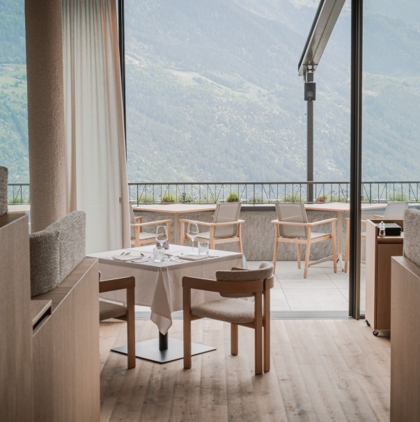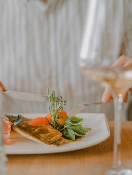 Beim Abendessen lenkt nichts ab von den Protagonisten auf dem Teller: den frischen und hochwertigen Zutaten, die vorzugsweise aus der nahen Umgebung oder sogar aus dem eigenen Garten stammen. Dazu tragen auch der dezente Service und die schlichte Gestaltung des Speisesaals bei. Als Begleiter warten unsere Bioweine aus Eigenbau und das Panorama, das von jedem Platz aus zu sehen ist.