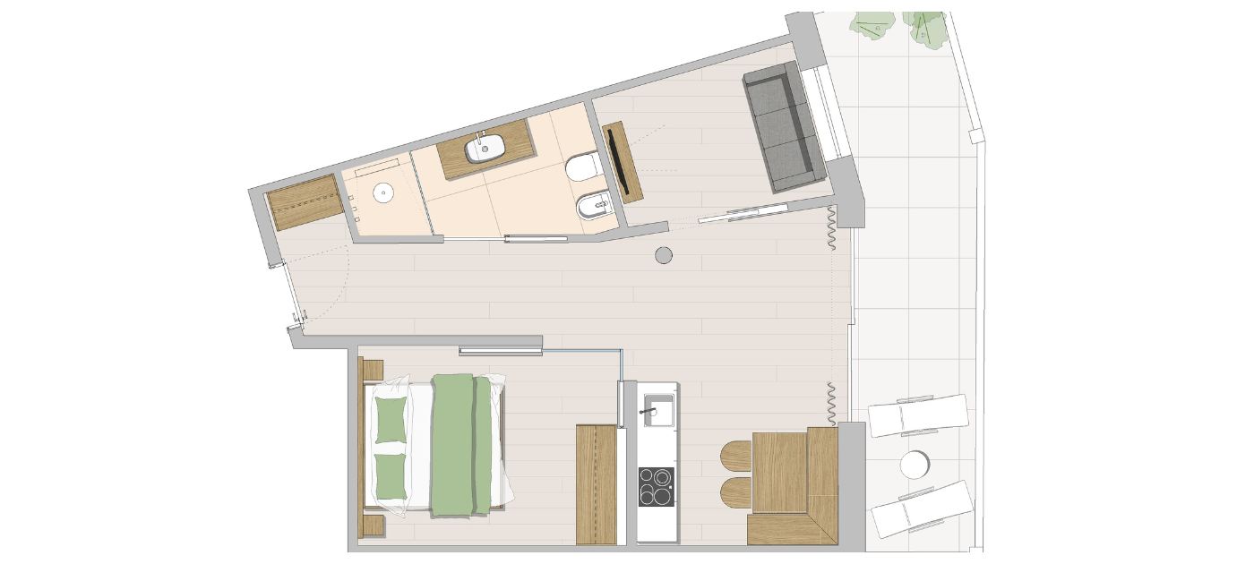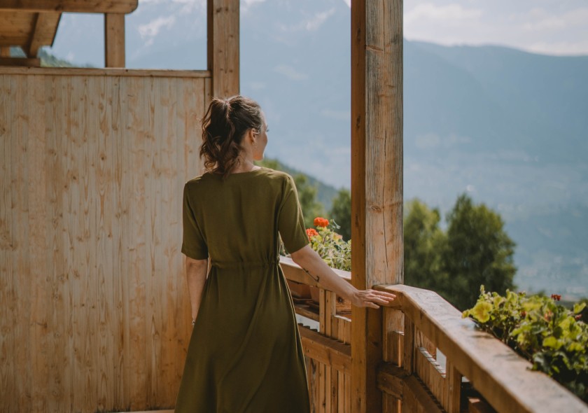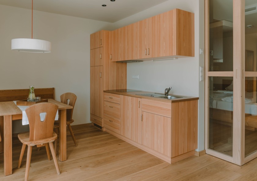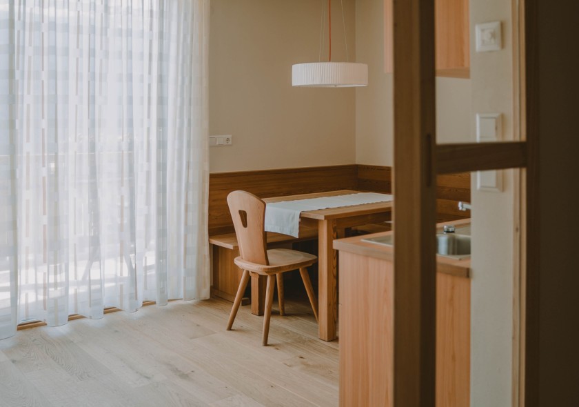 Das natürlich helle Appartement verfügt über einen abgetrennten Wohnbereich, ein Schlafzimmer mit Doppelbett und eine Kochnische mit Sitzecke. In den Betten aus alpinem Zirbenholz schlafen Sie besonders erholsam, der Wohnbereich verfügt zudem über ein kuscheliges Sofa. Der Boden aus Natureiche sorgt für behagliches Zuhause- und Naturgefühl. Vom großen Balkon aus genießen Sie einen wunderschönen Ausblick auf Meran und die umliegende Bergwelt.