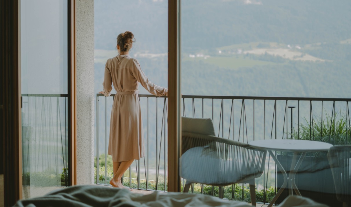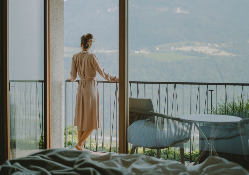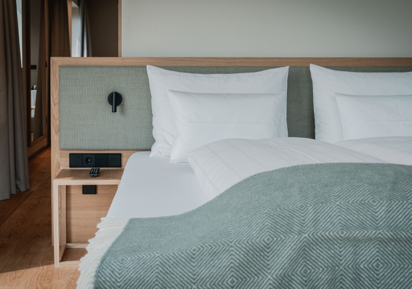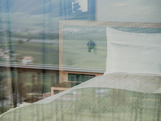 La nuova camera matrimoniale Nature ha una vetrata che ricopre tutta la parete esposta a sud per consentirti di godere appieno della vista panoramica sulla valle. I mobili realizzati con legno della zona, i tessuti naturali e il pavimento in rovere non trattato aumentano la sensazione di comfort.